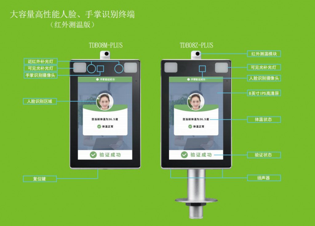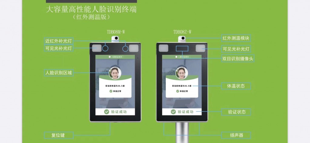 配备强大的CPU和全新AI深度自主学习面部识别算法,揭开生物识别领域新篇章。此版本支持多50,000张人脸底库,人脸识别速度小于0.3秒,采用双目光电硬件+活体识别算法,对打印的高清人脸图片、照片、人脸图像视频以及各种材料面具的攻击,具有较强的防伪能力。